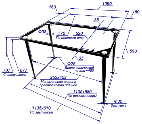 Изделие соответствует техническим условиям ТУ 568230-101-26990135-2003 “Каркасы столов”. Предельные отклонения размеров: габаритных ± 4, межосевых ± 2.
