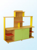 изготовлен из ЛДСП, торцы облицованы кромкой ПВХ 2 мм. Состоит из тумбы с 2 дверями, с обеих сторон тумбы по 2 закругленные полки и надстройки с 4 полками