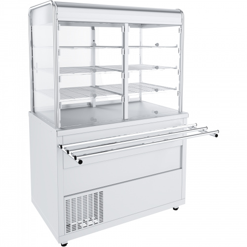 Закрытая демонстрационная витрина имеет площадь охлаждаемой столешницы: 0,64 м², перфорированных полкок: 1,56м², полезный объем витрины 0,5 м³. Плавная регулировка температуры 10...15°С. Контроллер. Номер хладагента: R290.