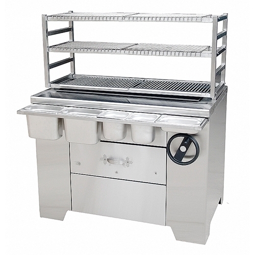 Многофункциональный мангал, работающий на твердом топливе, 4 решетки для жарки из н/стали,5 уровней для сеток 8 сеток из н/стали для стейков/рыбы, овощей, 2 выдвижных ящика для золы, 4 выдвижных инвентарных ящика, подъемный механизм решеток для жарки, 2 регулируемых поддувала, 8 гастроемкостей для соусов различной вместимости, очаг мангала выполнен из чугуна, габаритные размеры мангала 2000x630х1422, габариты брутто 2100х820х1700 мм, 394 кг, эквивалентная мощность 78 кВ